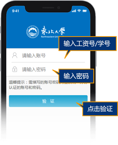 进入到验证页面后,输入您的统一身份认证账号和密码,点击验证,完成身份验证。